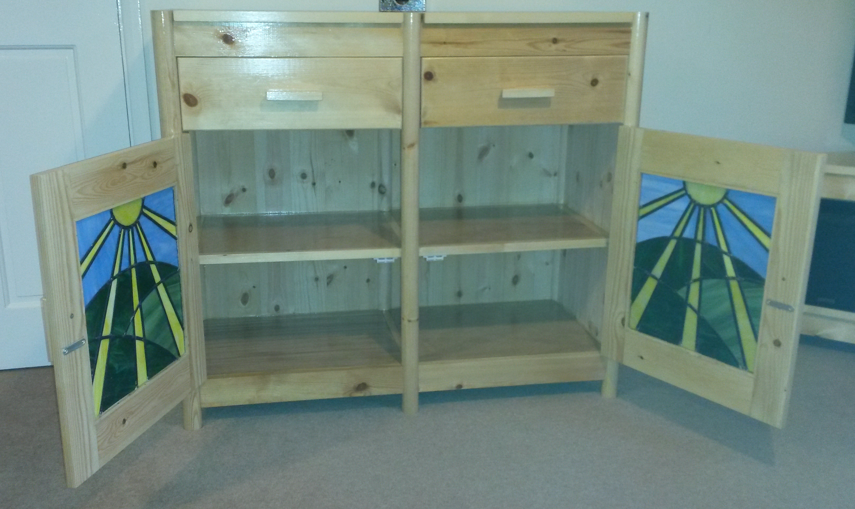 Living room cabinet with stain glass doors, looking inside.